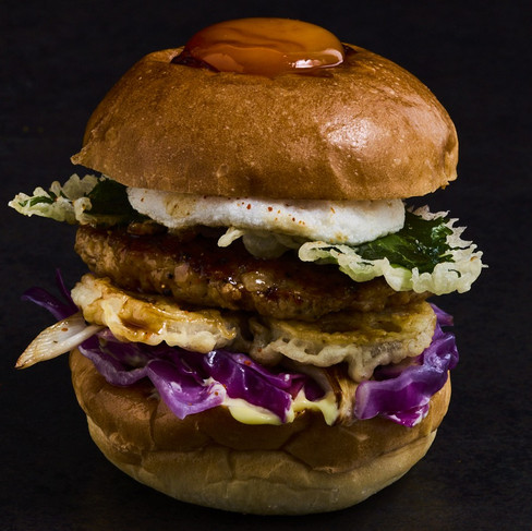 秋の味覚を詰めた「SUPER月見フェア」では、透明醬油に漬けた卵黄を、月と地球が最も接近する満月「スーパームーン」をイメージして上のバンズにはめこんでいます。パティは玉ねぎをたっぷりと使用してふんわり食感にした鶏つくねに甘辛いタレをまとわせ、蓮根と大葉の天ぷら、焼いたメレンゲは曇に見立てることで、ハンバーガー全体でお月見を表現しました。
